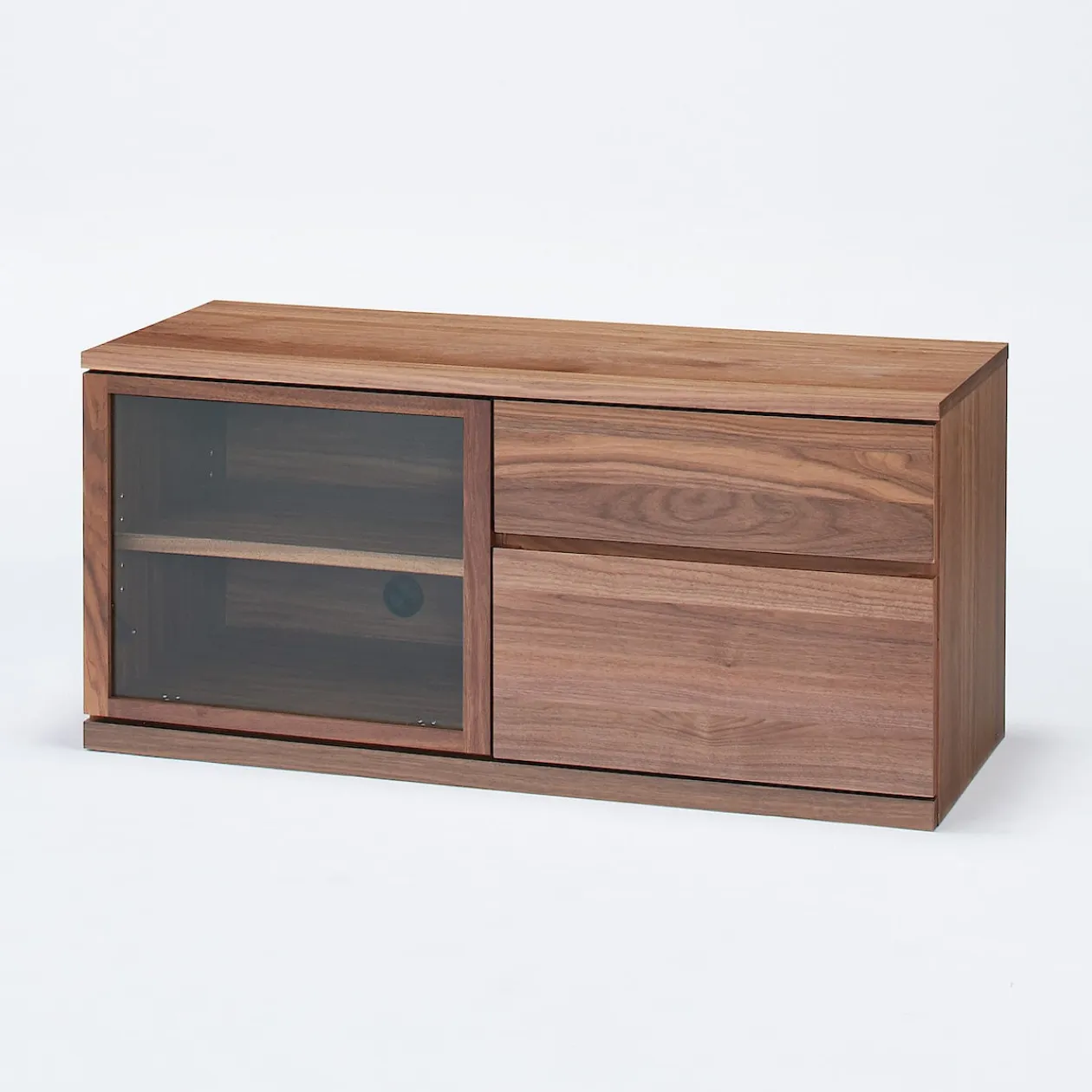 De l’espace pour votre écran, de la place pour plus. Un meuble TV compact en placage noyer offrant un rangement pratique dans une forme épurée et discrète. La finition avec un revêtement en uréthane transparent garantit une durabilité au quotidien.