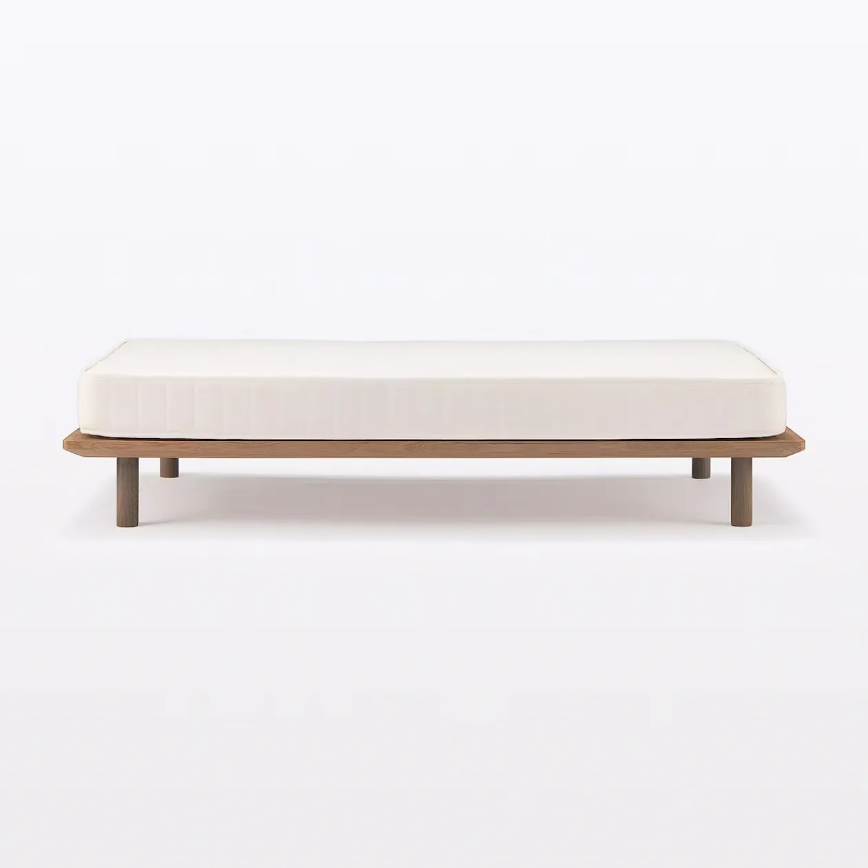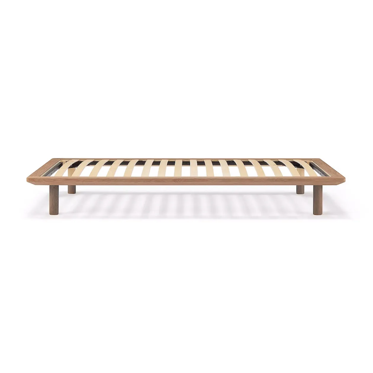 Le cadre fin donne à ce lit une ligne discrète et sobre. Les lattes en bois sont conçues pour offrir un confort optimal. Finition chêne ou noyer. Pieds vendus séparément.