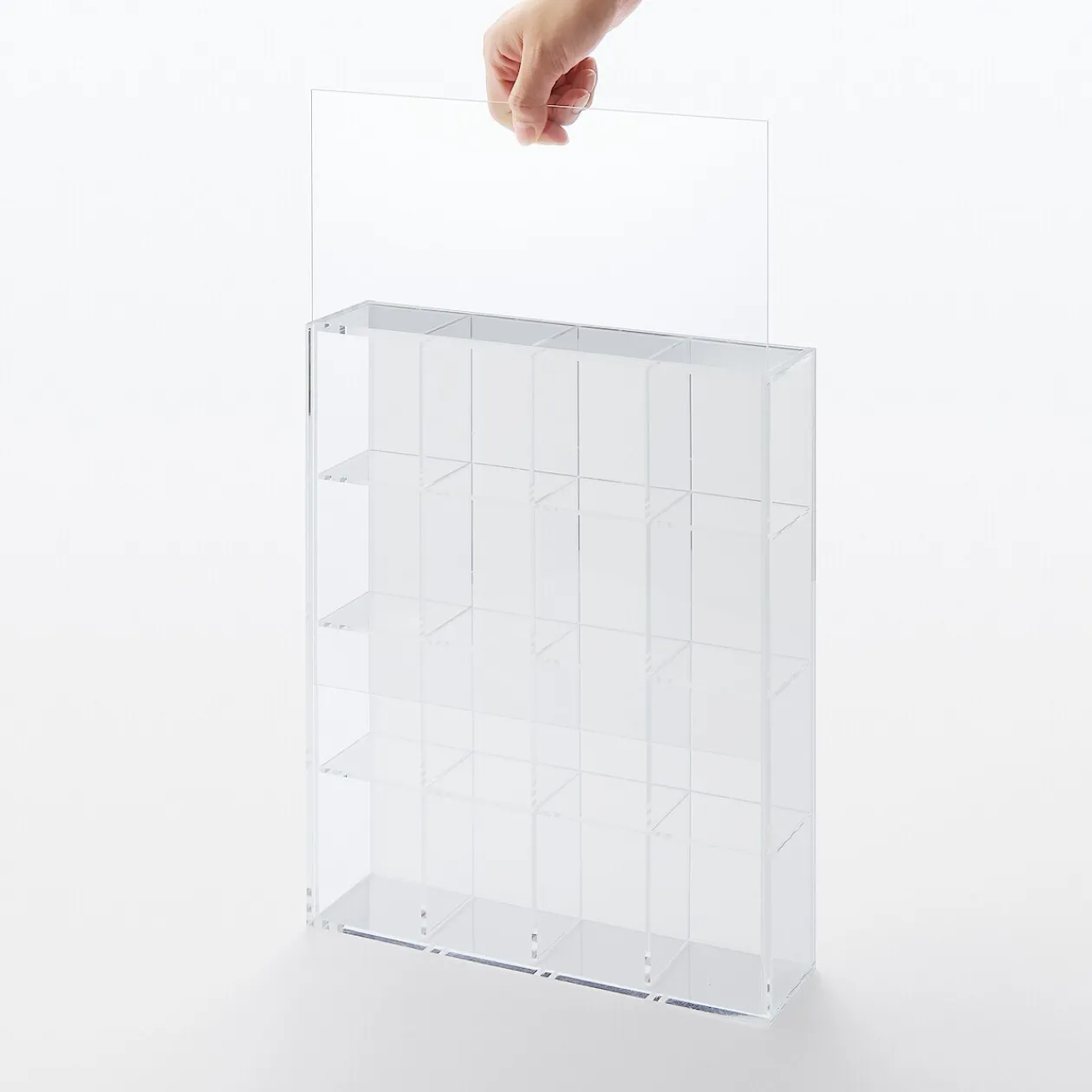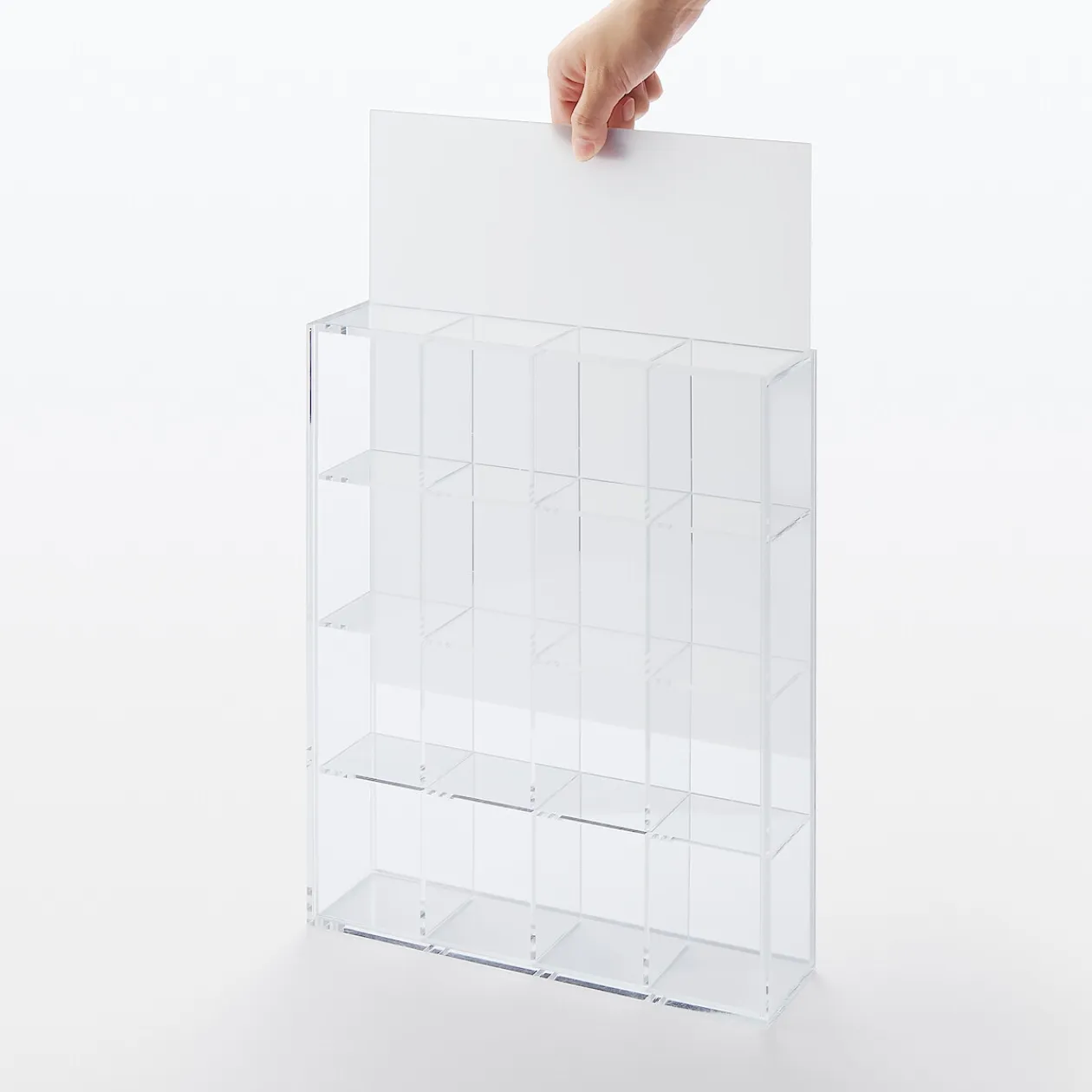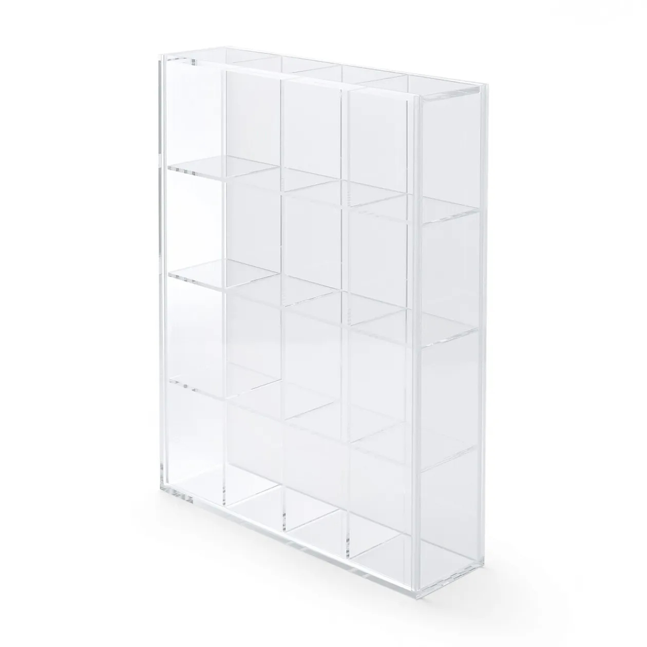 Tout organisé et visible en un endroit. Boîte de rangement en acrylique avec 16 compartiments, conçue pour des articles de petite taille. La face avant est dotée d’un panneau coulissant transparent, tandis que l’arrière présente un panneau coulissant translucide qui peut également être retiré.