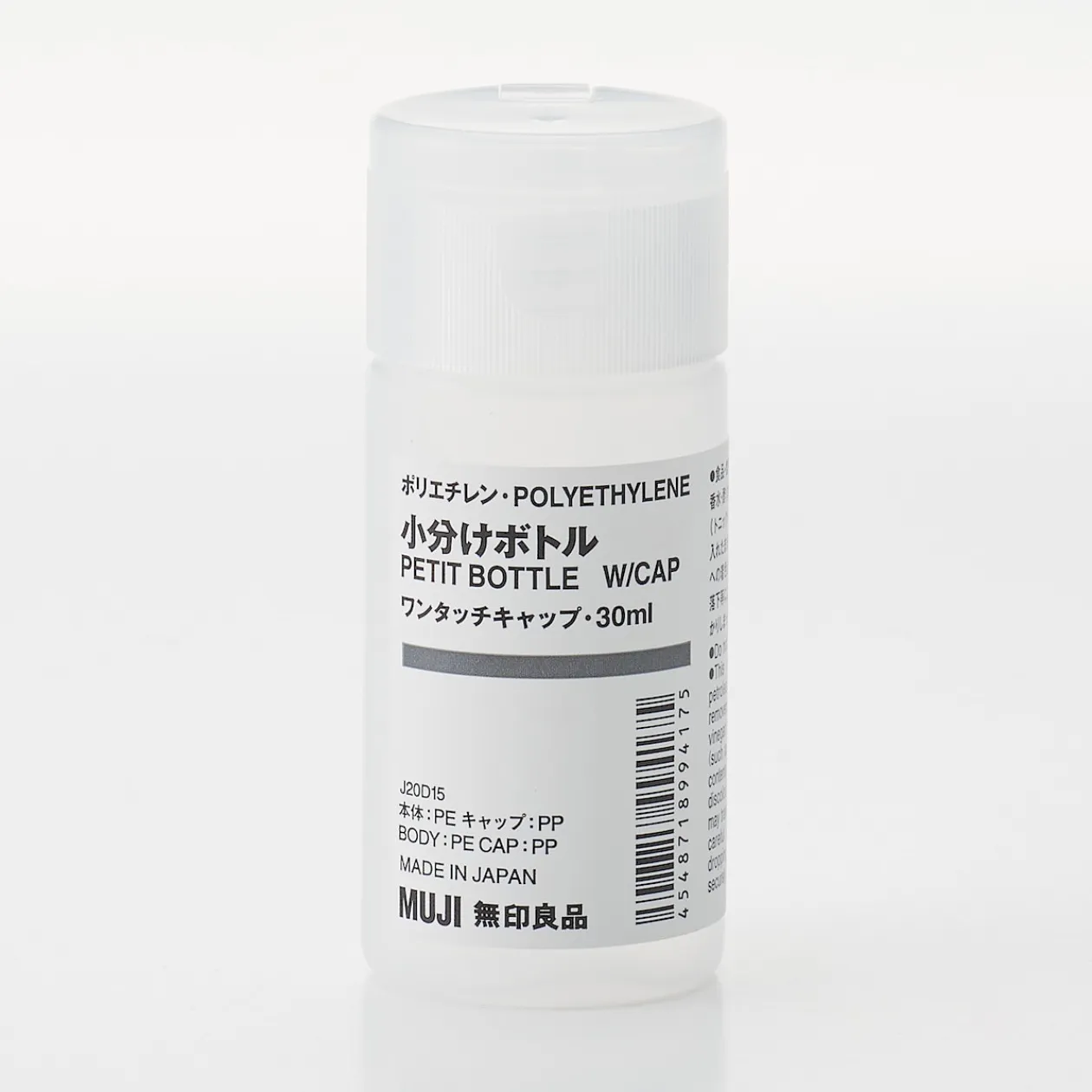 Fiole bouchon à clip ‐ 30ml.Pour respecter les règles de sécurité dans les avions, pour les bagages en cabine, Muji a développé une gamme de fioles et flacons de voyage dont les contenances vont de 30ml à 100ml.Flacons bouchon a vis: lotions. Flacon avec pulvérisateur: liquides a base d’eau. Flacons à pompe: lait hydratant et crèmes pour le corps. Flacons à corps souple et bouchon a clip: gels douche et shampoings.NE CONVIENT PAS POUR: parfum, alcool, solvants, vinaigre.