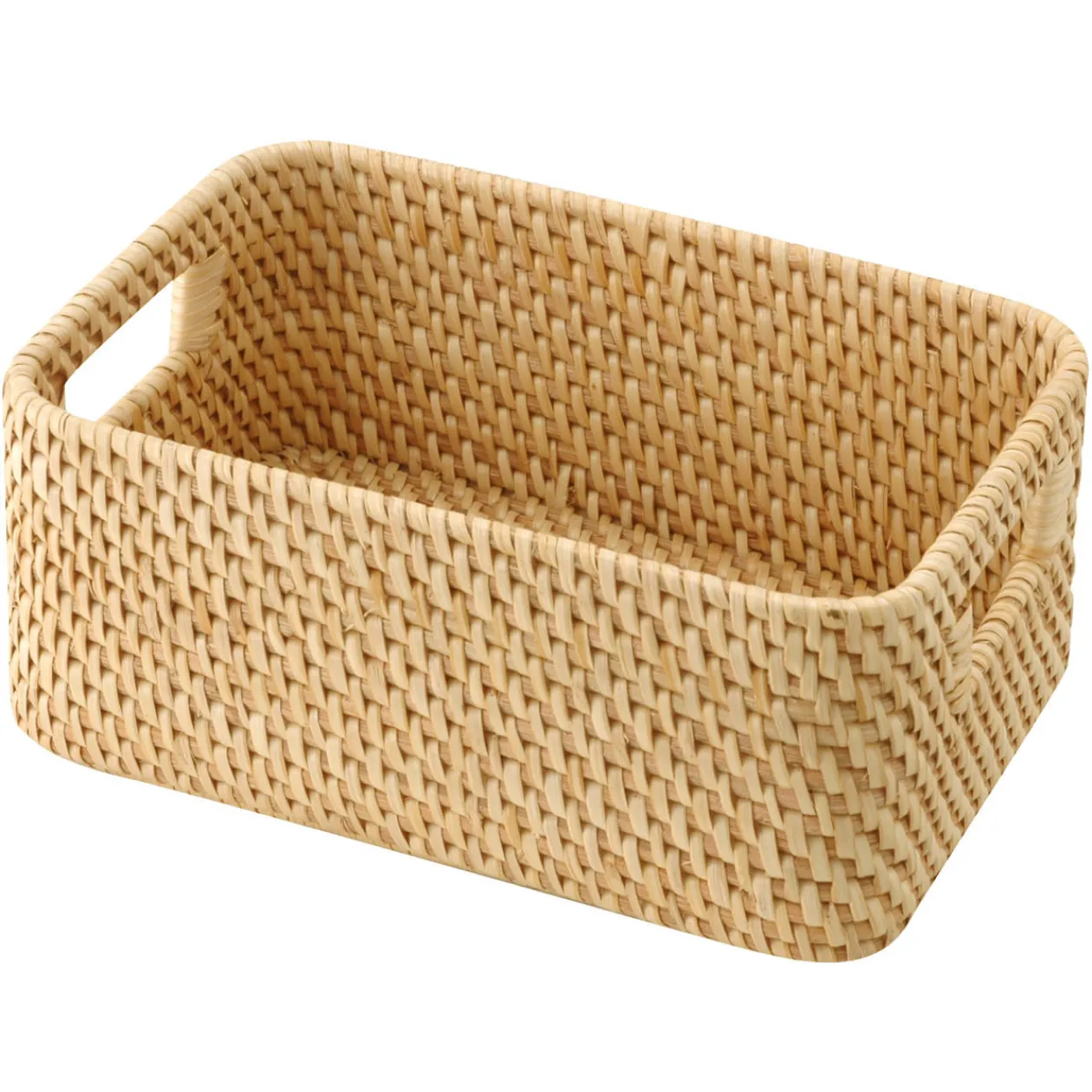 Panier à poignées en rotin S. Largeur 15cm X Profondeur 22cm X Hauteur 9cm.Le rotin est une canne qui pousse rapidement et permet de protéger les forêts en offrant un choix alternatif. Le rotin est utilisé depuis des siècles, il est réputé pour sa légèreté et sa solidité.